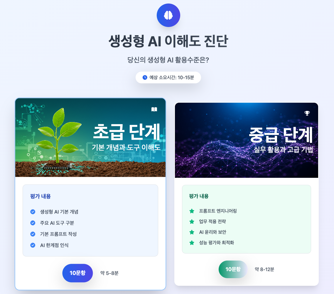 초급 퀴즈에서는 생성형 AI의 기본 개념과 주요 서비스들에 대한 기초 지식을 확인하고,